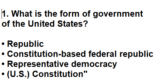 | 001. What is the form of government of the United States? |