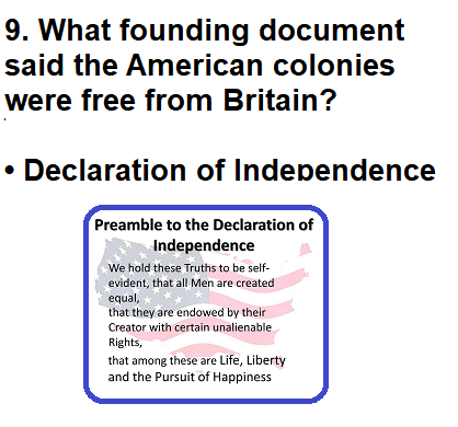 | 009. What founding document said the American colonies were free from Britain? |