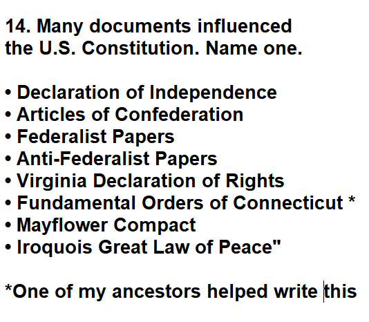 | 014. Many documents influenced the U.S. Constitution. Name one. |