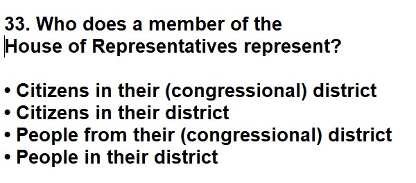 | 033. Who does a member of the House of Representatives represent? |