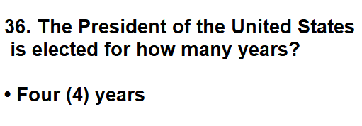 | 036. The President of the United States is elected for how many years? |