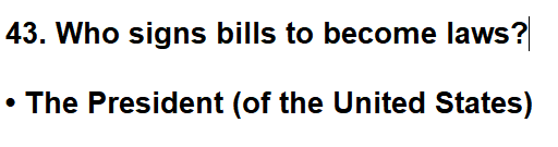 | 043. Who signs bills to become laws? |