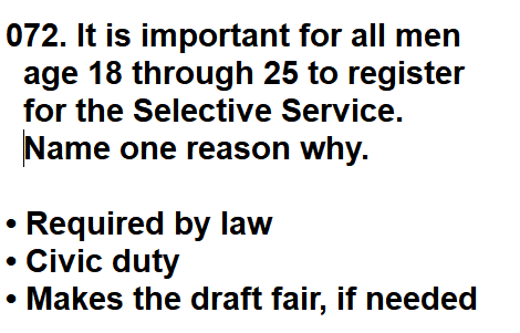 | 072. It is important for all men age 18 through 25 to register for the Selective Service. Name one reason why. |
