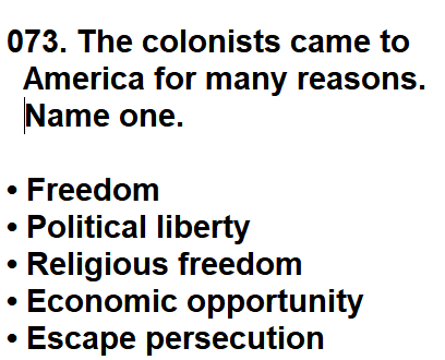 | 073. The colonists came to America for many reasons. Name one. |