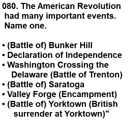 | 080. The American Revolution had many important events. Name one. |