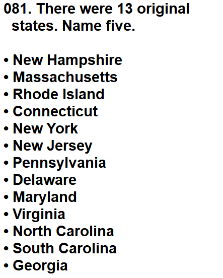 | 081. There were 13 original states. Name five. |