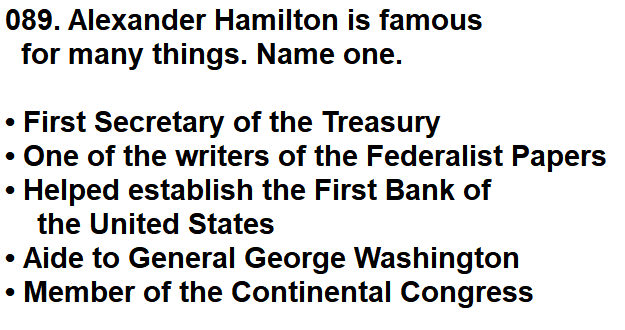 | 089. Alexander Hamilton is famous for many things. Name one. |