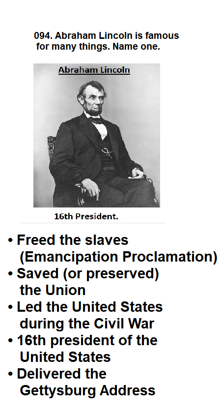 | 094. Abraham Lincoln is famous for many things. Name one. |